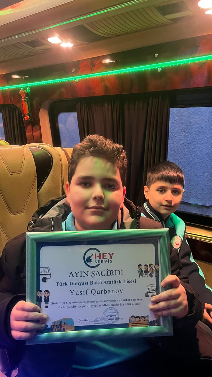“Türk Dünyası Bakı Atatürk Liseyi”nin şagirdi Yusif Qurbanov servisdəki nümunəvi davranışlarına görə, “Hey Servis”şirkəti tərəfindən ayın şagirdi seçildi ,Yusifi təbrik edir,uğurlar arzu edirik