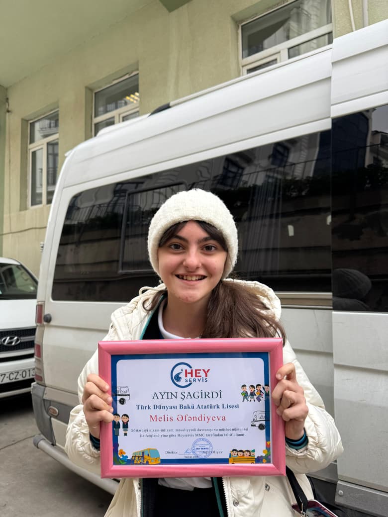 “Türk Dünyası Bakı Atatürk Liseyi”nin şagirdi Melis Əfəndiyeva servisdəki nümunəvi davranışlarına görə, “Hey Servis”şirkəti tərəfindən ayın şagirdi seçildi ,Melisi təbrik edir,uğurlar arzu edirik