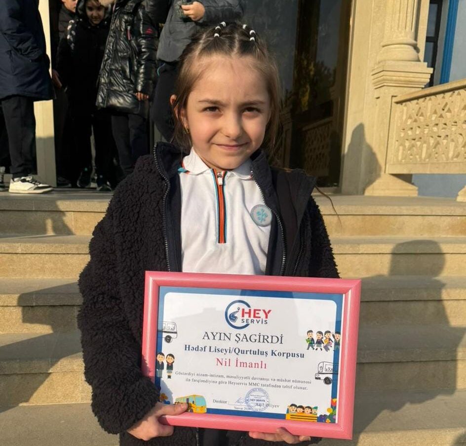 “Hədəf Liseyi /Qurtuluş Kotpusu”nin şagirdi Nil İmanlı servisdəki nümunəvi davranışlarına görə, “Hey Servis”şirkəti tərəfindən ayın şagirdi seçildi ,Nili təbrik edir,uğurlar arzu edirik