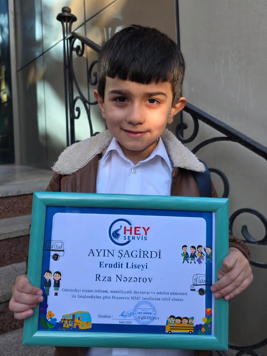 “Erudit Liseyi”nin şagirdi Rza Nəzərov servisdəki nümunəvi davranışlarına görə, “Hey Servis”şirkəti tərəfindən ayın şagirdi seçildi , Rzanı təbrik edir,uğurlar arzu edirik