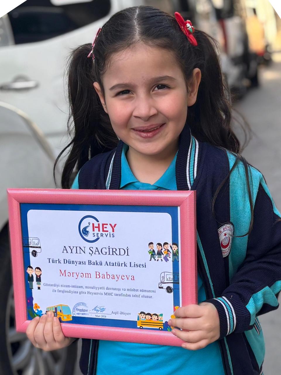 “Türk Dünyası Bakü Atatürk Lisesi”nin şagirdi Məryəm Babayeva servisdəki nümunəvi davranışlarına görə, “Hey Servis”şirkəti tərəfindən ayın şagirdi seçildi ,Məryəmi təbrik edir,uğurlar arzu edirik