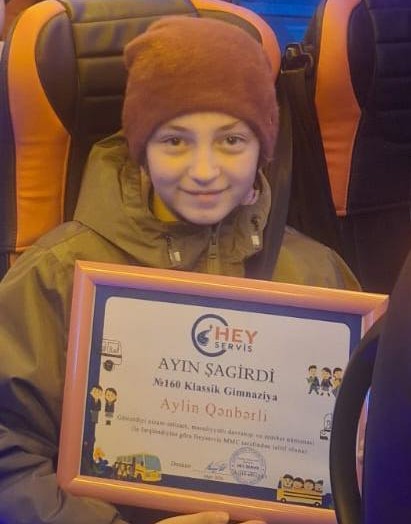 “160 saylı Klassik Gimnaziya”nin şagirdi Aylin Qənbərli servisdəki nümunəvi davranışlarına görə, “Hey Servis”şirkəti tərəfindən ayın şagirdi seçildi , Aylini təbrik edir,uğurlar arzu edirik