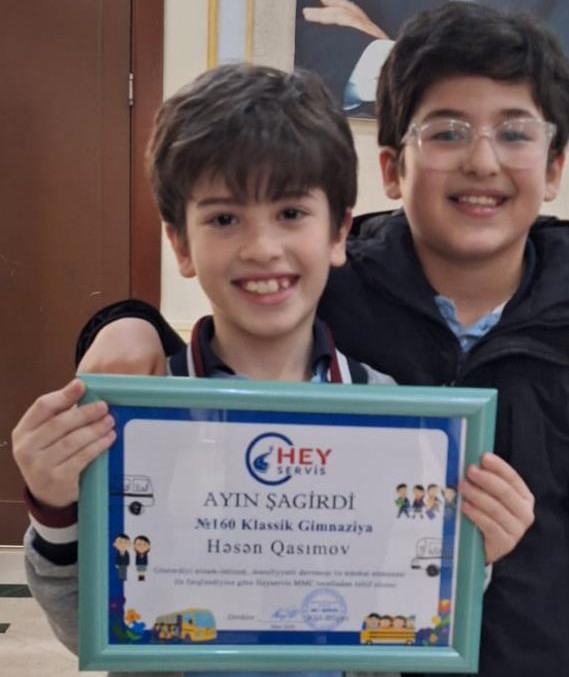 “160 saylı Klassik Gimnaziya”nin şagirdi Həsən Qasımov servisdəki nümunəvi davranışlarına görə, “Hey Servis”şirkəti tərəfindən ayın şagirdi seçildi , Həsəni təbrik edir,uğurlar arzu edirik