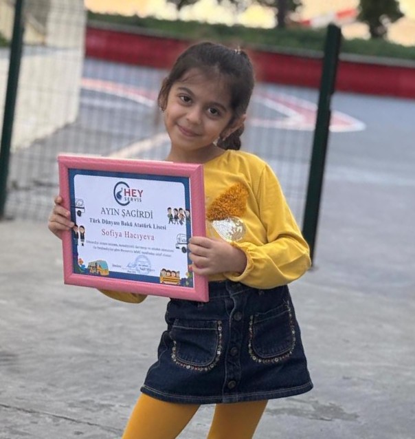 “Türk Dünyası Bakü Atatürk Lisesi”nin şagirdi Sofiya Hacıyeva servisdəki nümunəvi davranışlarına görə, “Hey Servis”şirkəti tərəfindən ayın şagirdi seçildi ,Sofiyanı təbrik edir,uğurlar arzu edirik